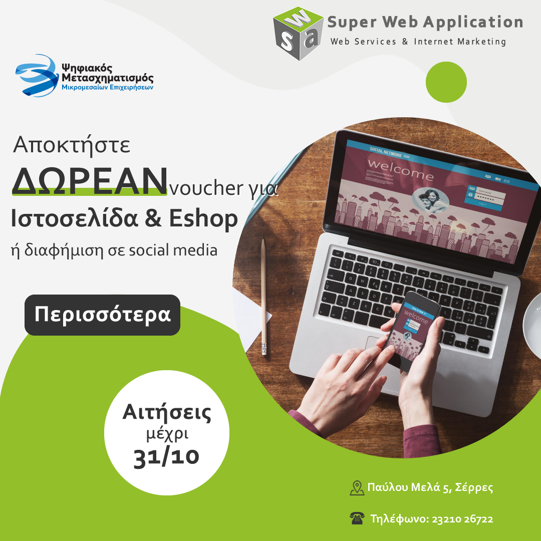 Η εταιρεία ΣΥΜΕΩΝ ΚΑΙ ΣΙΑ ΟΕ - Super Web Application είναι εγκεκριμένος προμηθευτής του προγράμματος, μέσω του οποίου μπορείς να αποκτήσεις την ιδανική λύση για ιστοσελίδα ή eshop για την επιχείρησή σου, καθώς και γενικότερη αυτοματοποίηση εργαλείων social marketing, παρακολούθησης digital campaign κ.α).